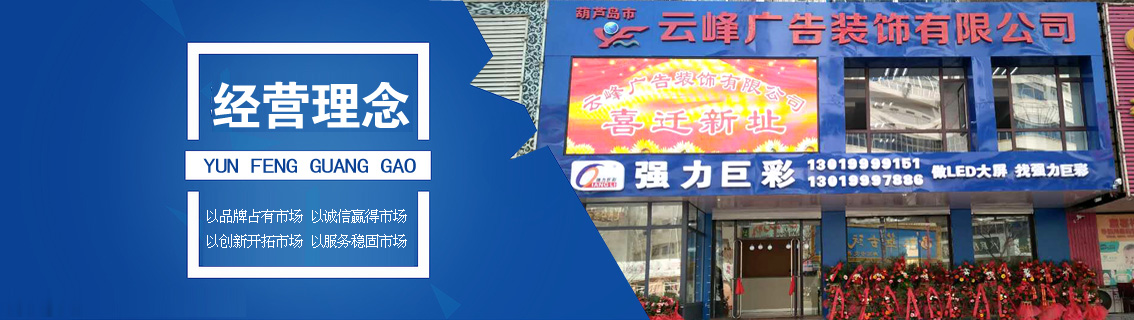 葫蘆島市云峰廣告裝飾有限公司自創(chuàng)立以來,一直致力于廣告牌的設計,噴繪,制作,安裝、LED工程、亮化工程、數(shù)碼圖文、圍擋制作安裝、三面翻廣告、大型擎天柱廣告、草坪牌、指示牌、雕刻背景墻、燈箱設計、標識標牌、金屬制品、亞克力字、展臺展柜、取款機隔斷、取款機隔斷等一體化服務,是葫蘆島市噴繪行業(yè)大規(guī)模實業(yè)公司。